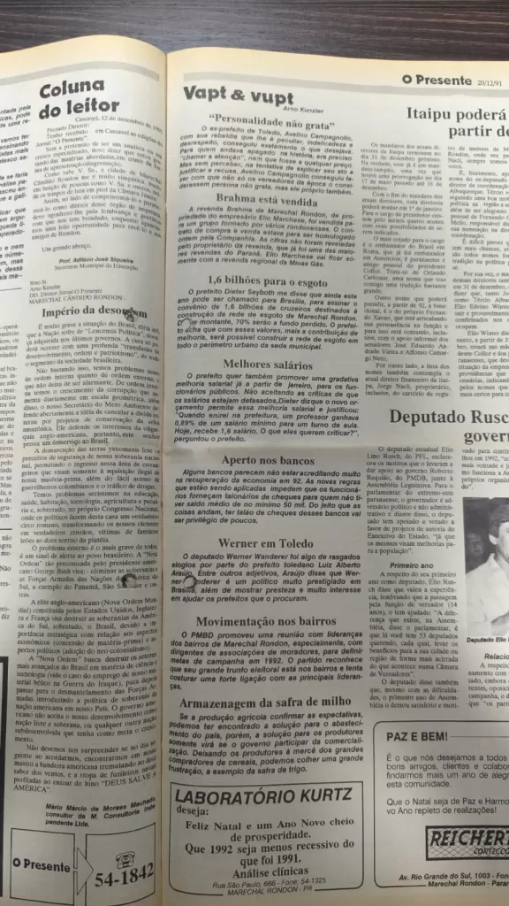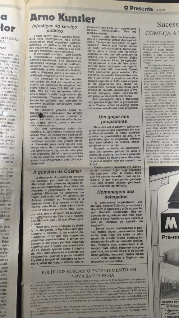 Desde a primeira edição de O Presente, a escrita de Arno Kunzler tem sido o termômetro da política e do desenvolvimento do Oeste paranaense. Seus textos não são apenas relatos; são análises críticas que, desde o início, buscaram tirar a sociedade da zona de conforto.