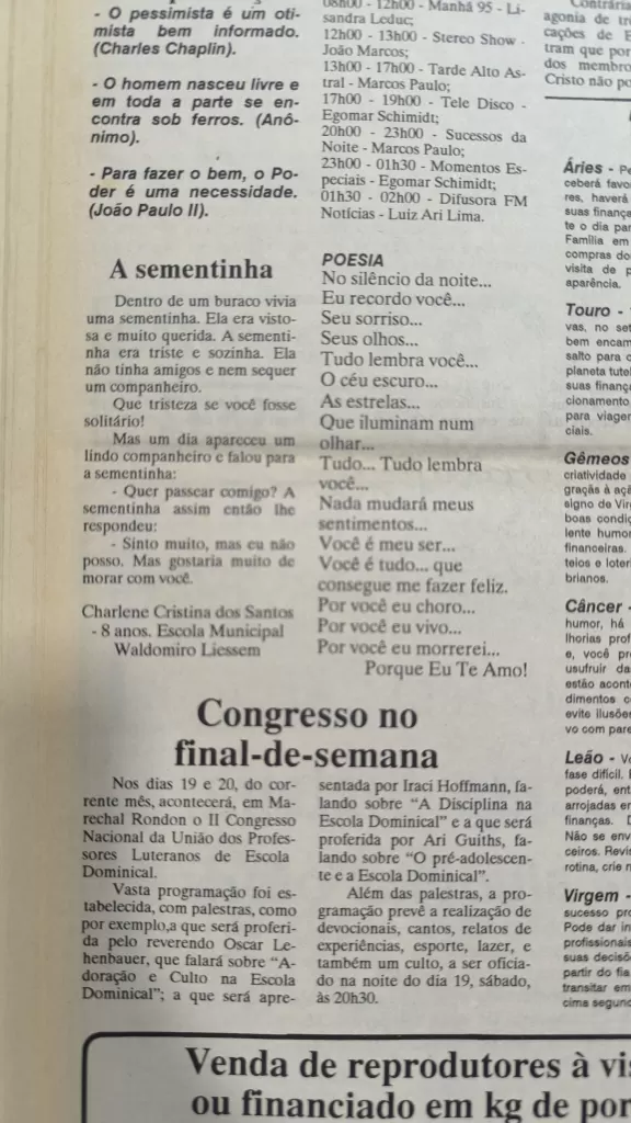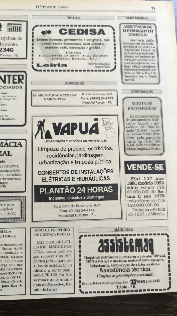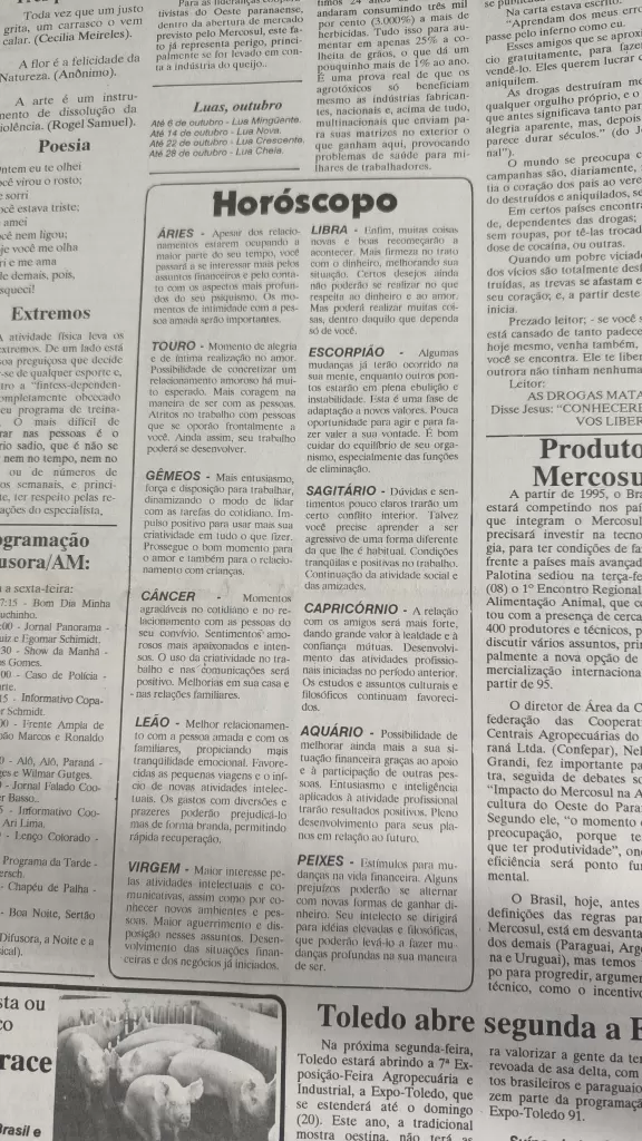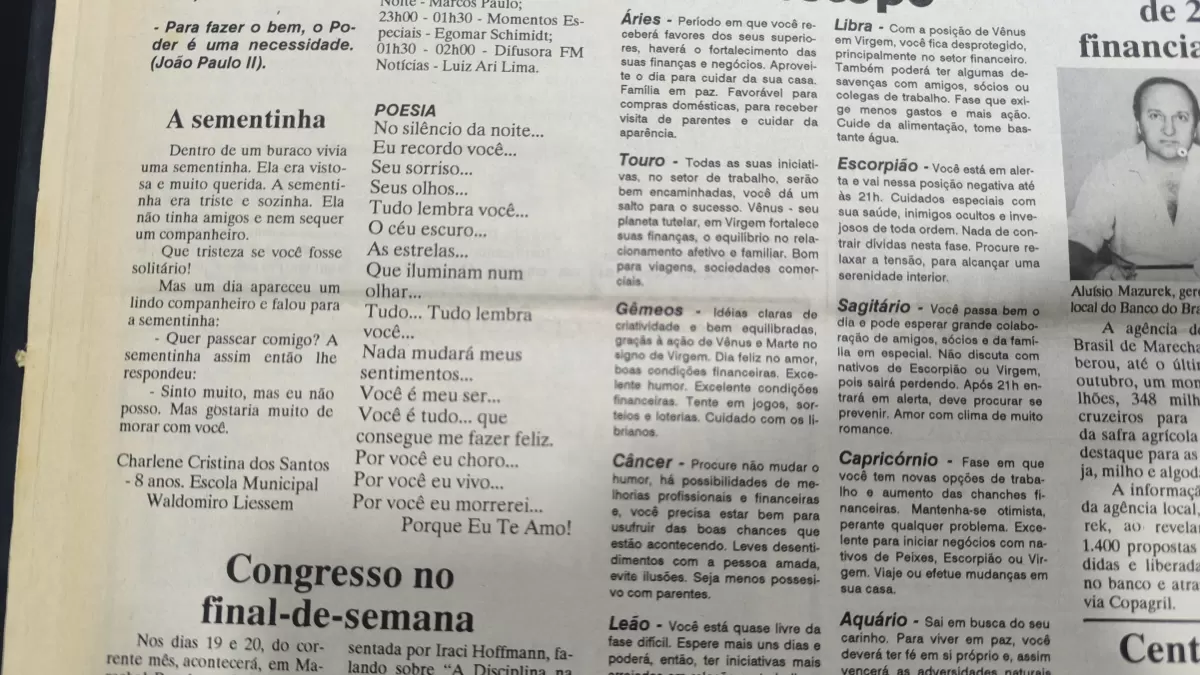 De 1991 a 1994, cada página do jornal contava histórias curiosas do cotidiano local. Anúncios de estabelecimentos mostravam preços na moeda da época: o cruzado. Algumas publicidades chamavam atenção pela criatividade. Páginas de poesia, humor, horóscopo e charges também faziam parte das edições. E mais do que informar, essas páginas registravam o espírito de uma época e nos fazem lembrar como a comunidade vivia, comprava e se divertia há mais de três décadas.