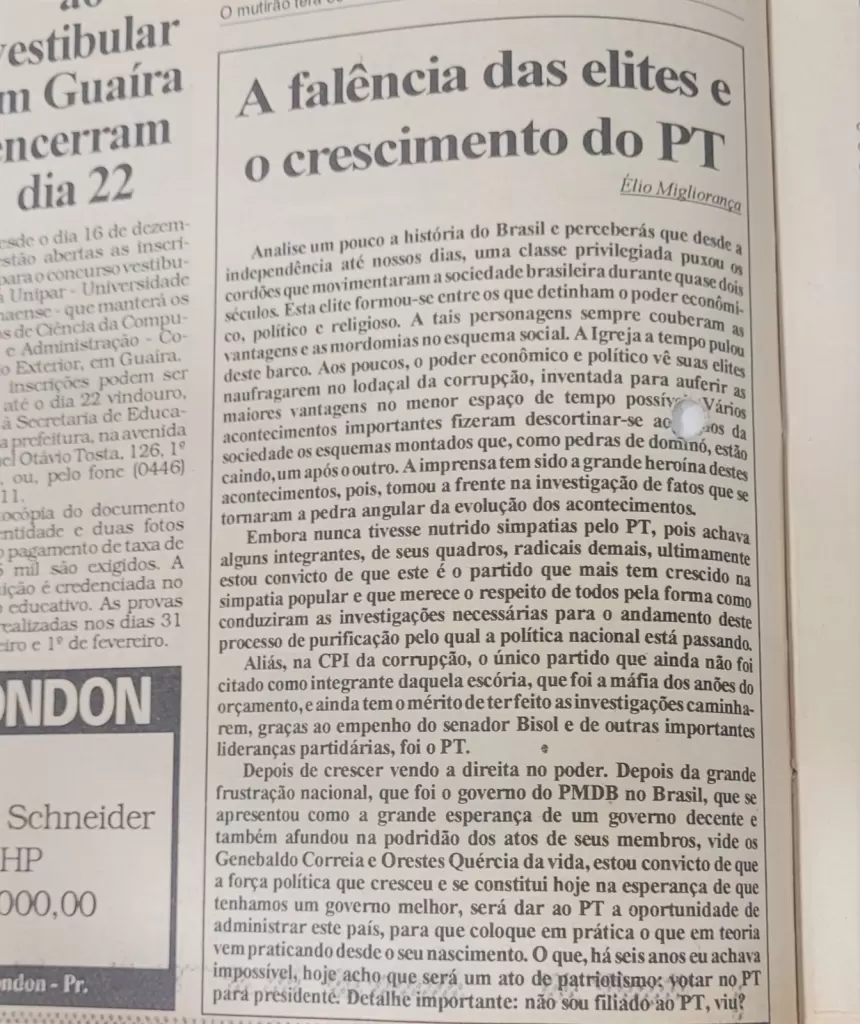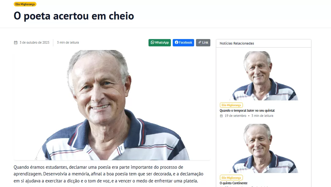 Desde os tempos de crítica política mais intensa, como em sua emblemática coluna “A falência das elites e o crescimento do PT”, até textos mais recentes como “O poeta acertou em cheio”, Elio Migliorança mostra sua versatilidade ao transitar entre o comentário crítico e a valorização da memória e da educação.