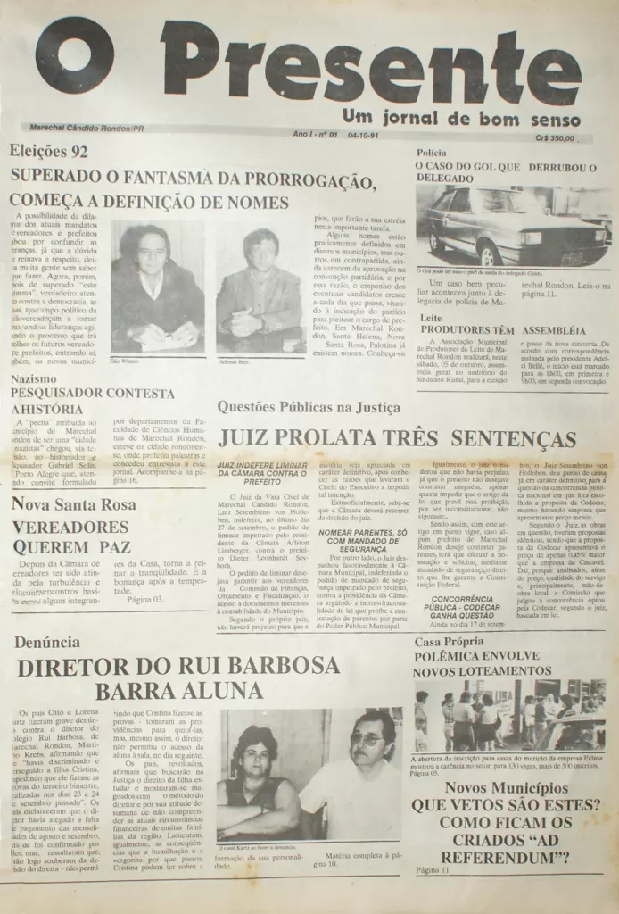 A primeira edição impressa do jornal O Presente, lançada em 4 de outubro de 1991, trazia a proposta de ser “um jornal de bom senso”, refletindo um compromisso com a informação clara e relevante para a comunidade.