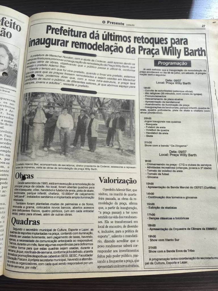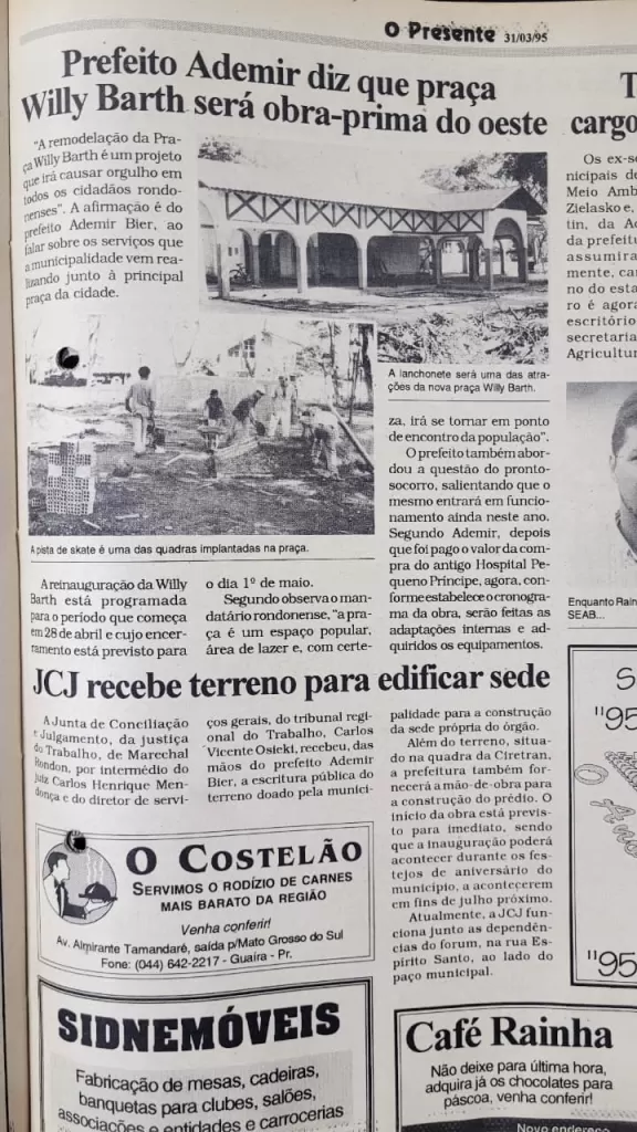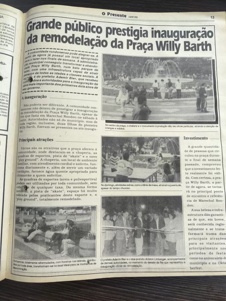 Em 1995, a principal praça de Marechal Cândido Rondon ganhou nova vida com uma grande revitalização que marcou época. Naquele ano, o espaço recebeu novo paisagismo, bancos, iluminação e o cuidado especial que transformou o local em ponto de encontro da comunidade.