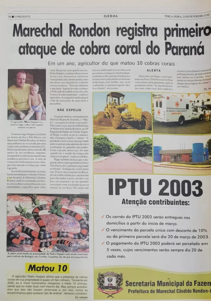 Nesta edição, mergulhamos nos arquivos de 25 de fevereiro de 2003. Naquele verão, há mais de duas décadas, a manchete principal de O Presente trazia um susto que mobilizou o distrito de Novo Três Passos: o primeiro registro oficial de um ataque de cobra coral no Paraná, ocorrido justamente em solo rondonense.
