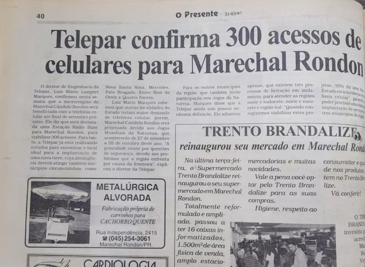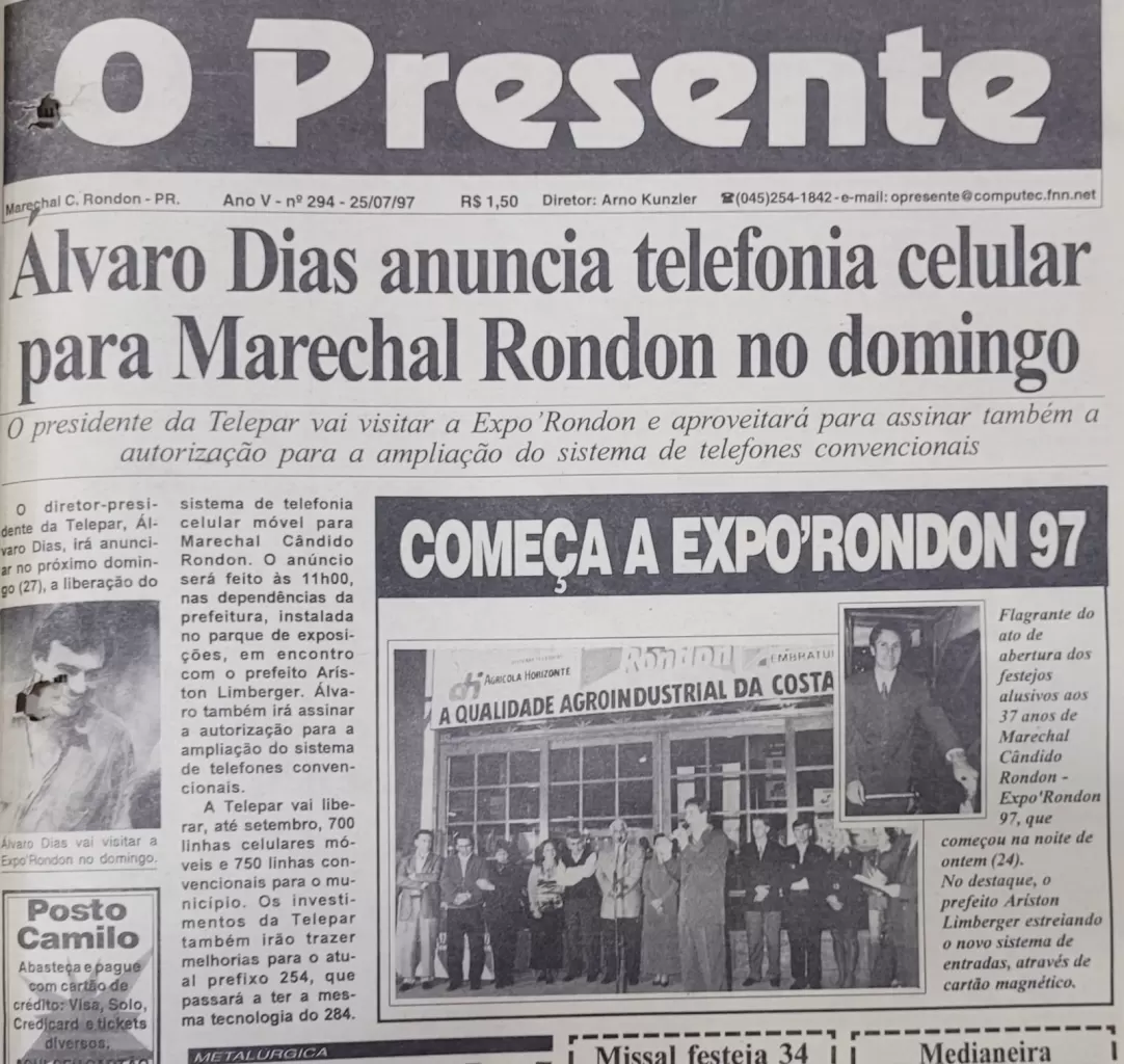A edição de 25 de julho de 1997 de O Presente trazia, em destaque, uma notícia que hoje parece simples, mas que na época representava um grande salto tecnológico para a região: a chegada da telefonia celular a Marechal Cândido Rondon, anunciada pelo então presidente da Telepar, Alvaro Dias.