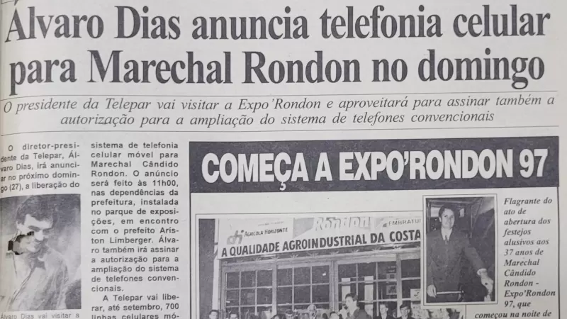 O anúncio seria oficializado durante visita à Expo Rondon 97, evento que movimentava o município e ganhava espaço de destaque na capa. Na reportagem, o jornal destacava que, além da implantação do sistema de telefonia móvel, seriam assinadas autorizações para a ampliação dos telefones convencionais — um problema comum dos anos 1990, quando a capacidade das linhas ainda era limitada e listas de espera eram longas.