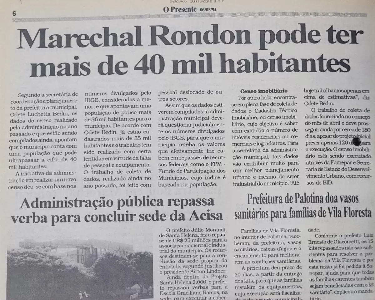 Em maio de 1994, o jornal O Presente noticiava com entusiasmo que Marechal Cândido Rondon poderia ultrapassar a marca de 40 mil habitantes. Na época, a informação vinha da secretária de Coordenação e Planejamento da prefeitura, Odete Luchetta Bedin, que destacava o crescimento populacional detectado pelo censo municipal.