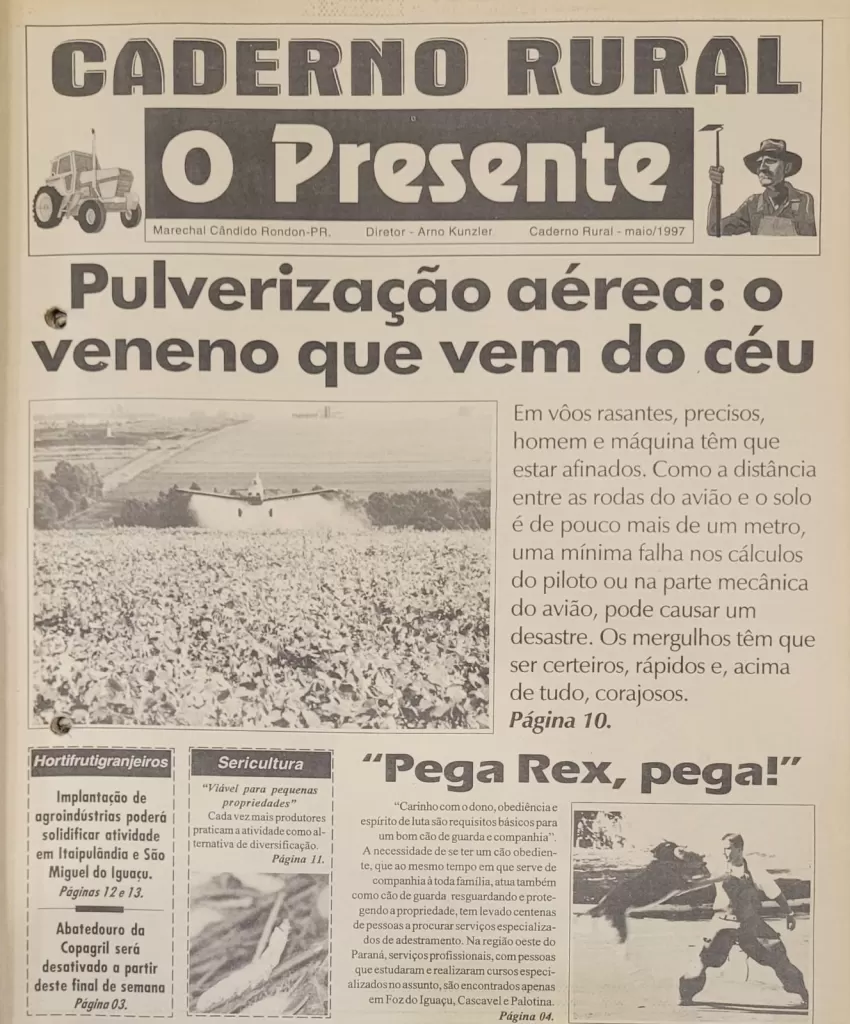 O Caderno Rural também abordava temas técnicos e polêmicos, como o uso de pulverização aérea — tema da edição de maio de 1997, que trouxe a manchete “Pulverização aérea: o veneno que vem do céu”, alertando para os cuidados necessários em práticas agrícolas cada vez mais mecanizadas.