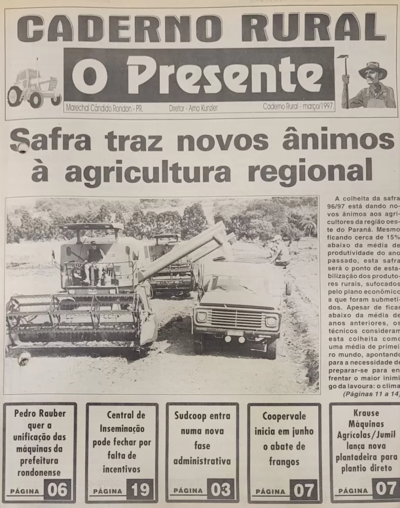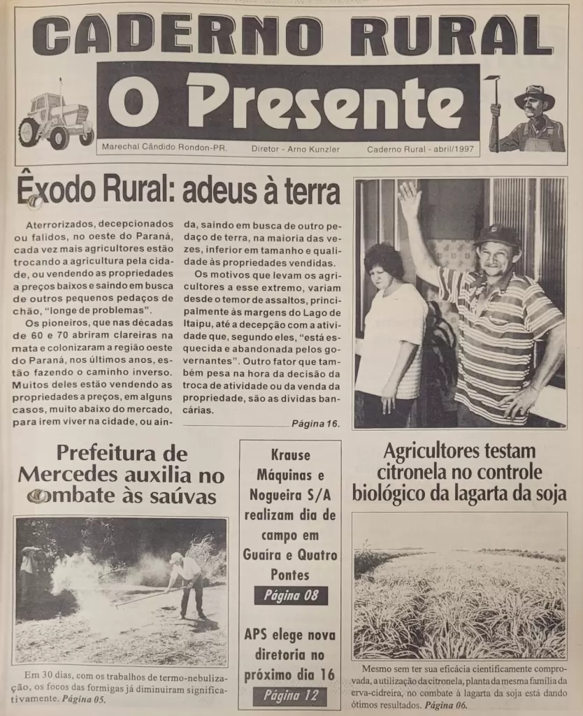 As primeiras edições traziam assuntos que marcaram a década: o êxodo rural, as incertezas econômicas, a necessidade de diversificação da produção e a busca por novas tecnologias. Em março daquele ano, o otimismo com a colheita estampou a capa com o título “Safra traz novos ânimos à agricultura regional”, mostrando que, apesar das dificuldades, o setor continuava sendo a base da economia local. já em abril de 1997, por exemplo, uma das manchetes destacava: “Êxodo Rural: adeus à terra”, refletindo a preocupação crescente com a saída de agricultores da região oeste do Paraná.