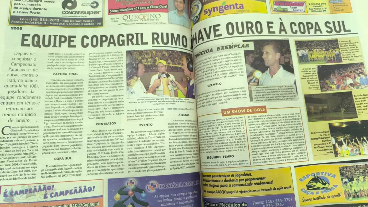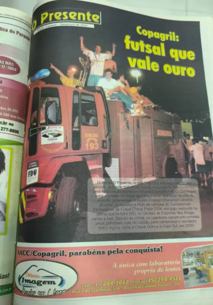 Em dezembro de 2004, O Presente registrava um dos momentos mais marcantes do esporte rondonense: a conquista da Copagril/AACC no Campeonato Paranaense de Futsal – Chave Prata. A manchete “Copagril: futsal que vale ouro” simbolizava a importância daquele título para a cidade.