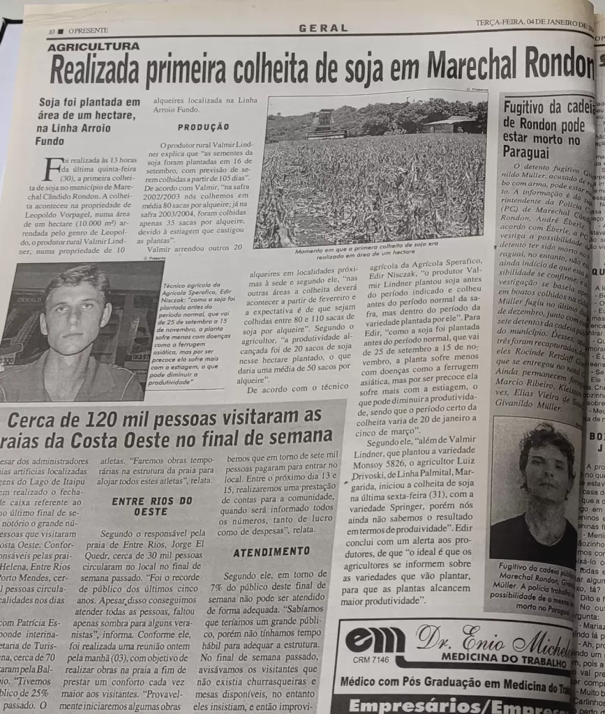 A coluna O Passado no Presente relembra um marco importante para a agricultura regional: a realização da primeira colheita de soja em Marechal Cândido Rondon. A matéria, publicada em janeiro, destacou o início de um ciclo que ajudaria a transformar o município em referência na produção agrícola.