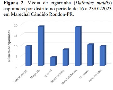O município apresentou média de 11,5 cigarrinhas por ponto de avaliação. O Distrito de Iguiporã apresentou menor presença do inseto (média de quatro cigarrinhas) e os Distritos de Margarida e Novo Três Passos apresentaram maior presença (média de 18,8 e 18,7 cigarrinhas, respectivamente). Os demais distritos apresentaram valores intermediários entre 7,8 e 10,2 cigarrinha por ponto na média.