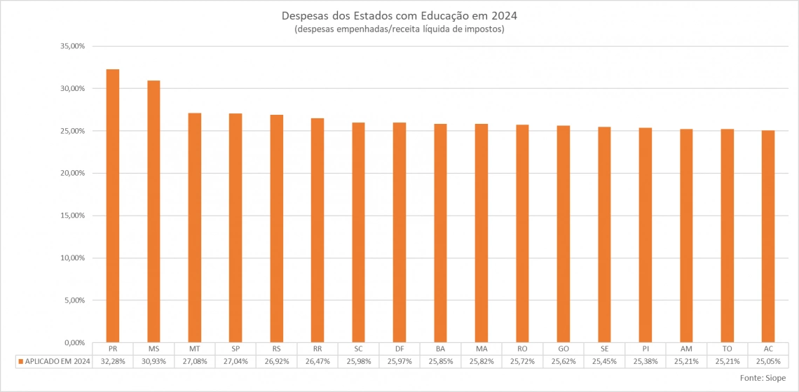 E embora nem todos os estados tenham divulgado seus Relatórios de Gestão Fiscal ainda, dados do Sistema de Informações sobre Orçamentos Públicos em Educação (Siope) levantados pela equipe de Assessoria Técnica de Economia da Sefa mostram que os 32,28% empenhados pelo Paraná o colocam no topo do ranking das unidades da federação. O Estado fica à frente do Mato Grosso do Sul (30,93%) e Mato Grosso (27,08%), os melhores estados com resultados publicados.