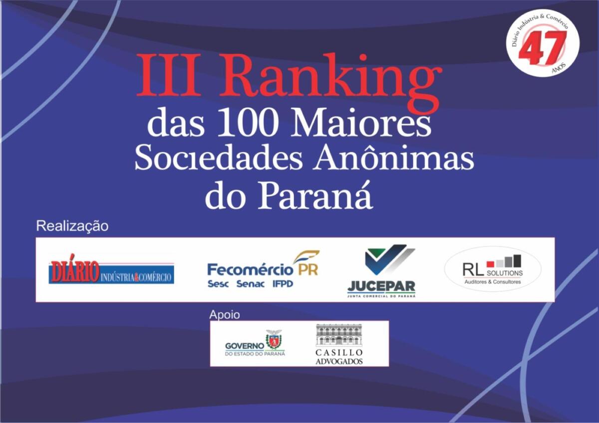 O Diário Indústria & Comércio, com apoio institucional da Federação do Comércio de Bens, Serviços e Turismo do Paraná (Fecomércio/PR), divulga no próximo dia 16 de maio o III Ranking das 100 Maiores Sociedades Anônimas (S/A) do Paraná. O levantamento foi elaborado com base na receita líquida do ano de 2021, divulgada nos balanços das empresas publicados nas mídias impressas e digitais em 2022.