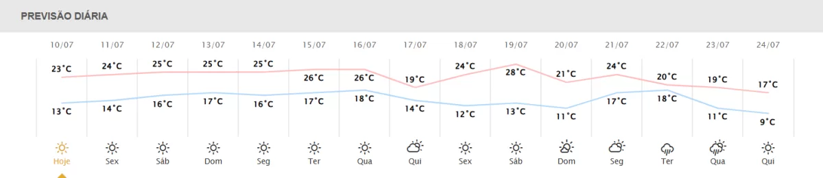 Dia ideal para programas ao ar livre, sem necessidade de previsão para chuva. Recomenda-se agasalho leve nas primeiras horas e aproveitar as temperaturas agradáveis ao longo da tarde.