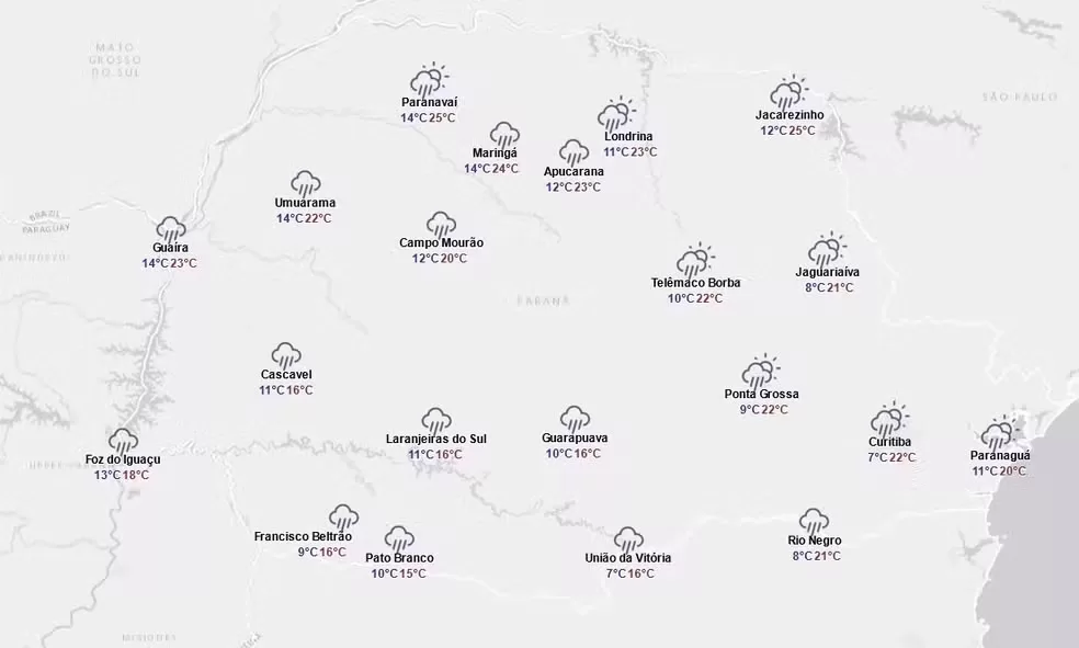 Veja, abaixo, a previsão do tempo do Simepar para cidades de diferentes regiões do Paraná.