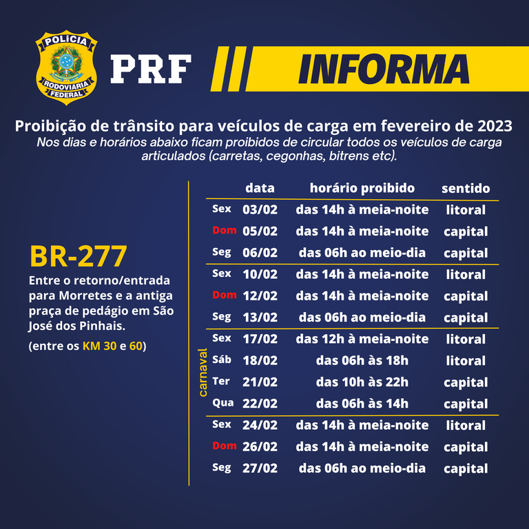 Com a continuidade das obras na BR-277 e a formação de longas filas pela indisponibilidade da capacidade total de tráfego da rodovia, a Polícia Rodoviária Federal (PRF) vai estender a restrição de circulação de veículos pesados no trecho entre Curitiba e Paranaguá, durante os finais de semana de de fevereiro. A decisão foi tomada em uma reunião na sede da PRF, com participação do diretor do Departamento de Estradas de Rodagem (DER) – representando o Governo do Estado do Paraná – engenheiros do Departamento Nacional de Infraestrutura Terrestre (DNIT) e administração do Porto de Paranaguá.