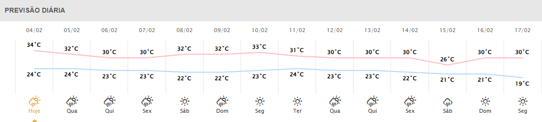 Marechal Cândido Rondon: Previsão de chuvas ocasionais e tempestade, com mínima de 23°C e máxima de 34°C.