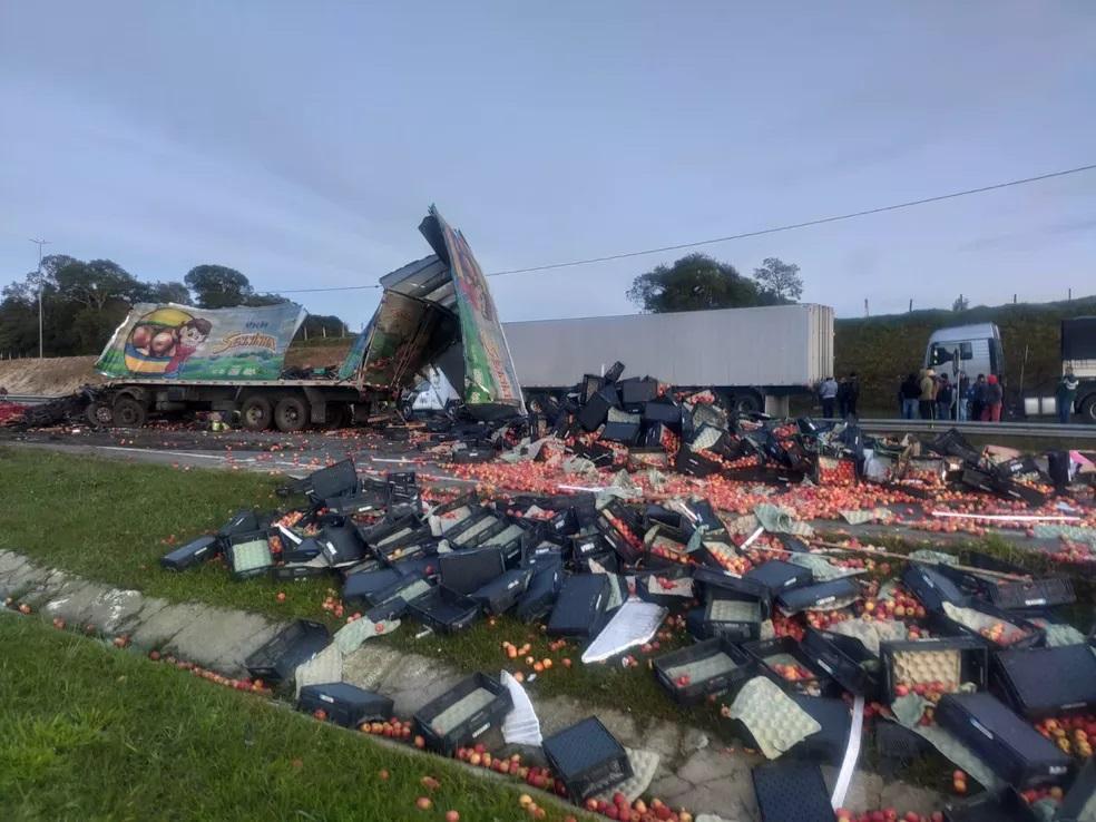 De acordo com a Polícia Rodoviária Federal (PRF) e a concessionária Arteris, que administra o trecho, um caminhão carregado com maçãs seguia na pista sentido norte e invadiu a outra pista, sentido sul, onde bateu contra o outro veículo, que transportava laranjas.