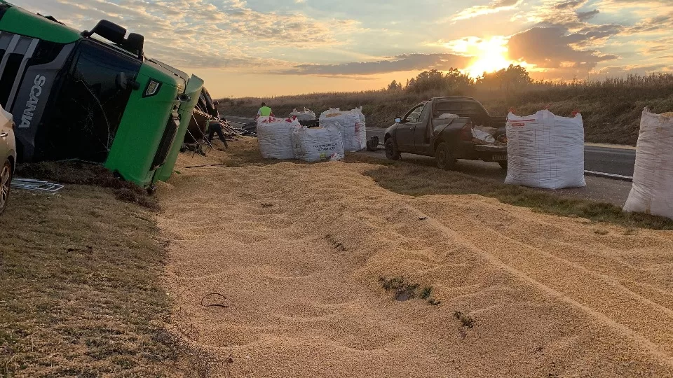 Uma carreta tombou na rodovia BR-163, no quilômetro 204, em Cascavel, nesta quarta-feira (23), após o motorista perder o controle da direção.