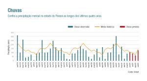 Para se ter ideia do tamanho do problema que o Paraná enfrenta em relação à escassez de água, em 27 dos últimos 41 meses a chuva ficou abaixo da média histórica (veja o gráfico abaixo). Nos meses de março, abril e maio é normal chover entre 300 e 400 milímetros (mm). Mas neste ano choveu entre 100 e 200 mm.