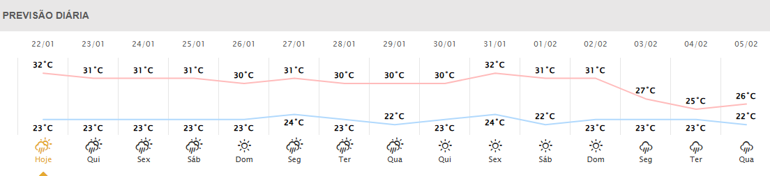 Foz do Iguaçu: mínima de 22°C e máxima de 33°C, céu parcialmente nublado com chuva isolada, principalmente à tarde.