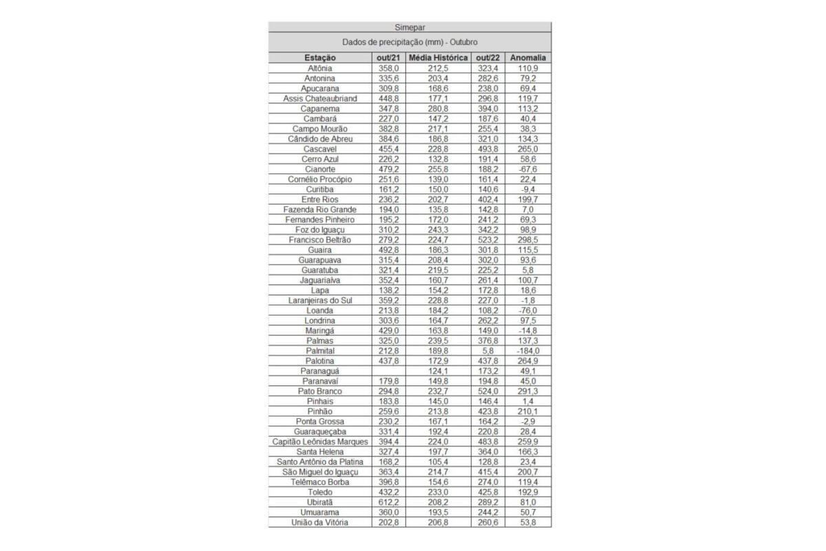 Na região Central, o município de Cândido de Abreu superou em 134,3 milímetros a média histórica para o mês, 186,8 milímetros. O total chegou a 321 milímetros em outubro. Em Pinhão, no Centro-Sul, choveu 423,8 milímetros – aumento de 210,1 milímetros em relação média (de 213,8 milímetros).