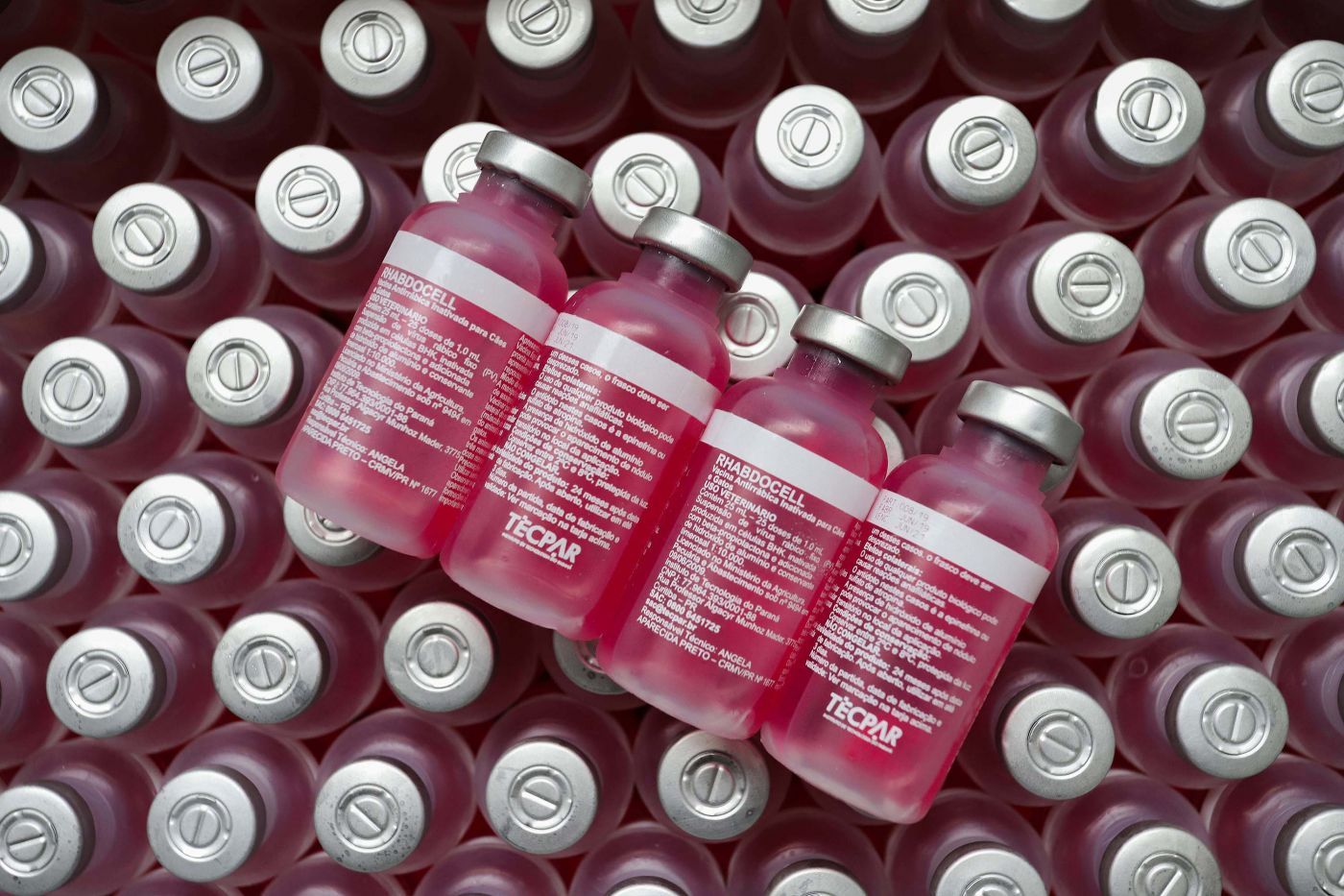 A metodologia de produção da vacina antirrábica veterinária do Tecpar utiliza células BHK-21 (Baby Hamster Kidney) e vírus PV (Pasteur Virus) em método de perfusão.