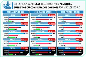 Na Macrorregião Oeste, de Foz do Iguaçu e Cascavel, no domingo (28) a ocupação bateu em 98%. No último dia de agosto do ano passado era 62%. Das atuais 229 UTIs, 225 estavam ocupadas no último dia de fevereiro. O menor índice foi registrado na Macrorregião Norte, de Londrina, com 93%. Das 221 vagas, 15 estavam disponíveis. No último dia de agosto de 2020, a ocupação era 58%. Havia 206 leitos, agora são 221.
