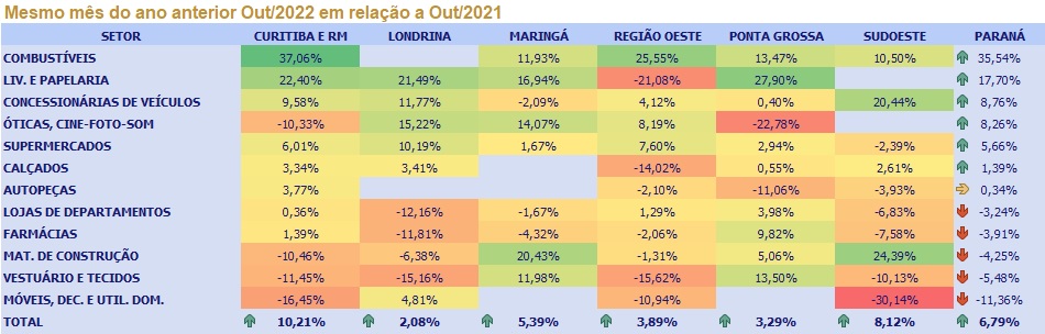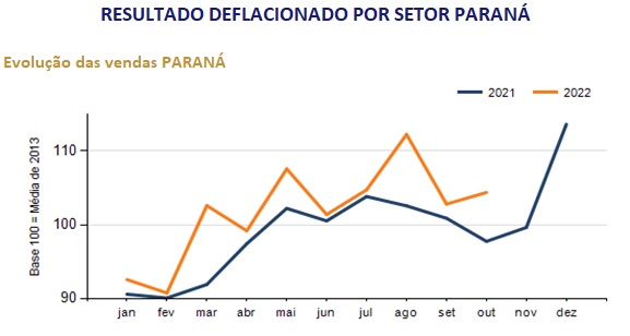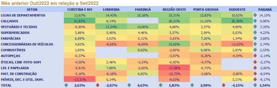 Na variação mensal (outubro/22 comparado a setembro/2022), as vendas do comércio paranaense foram 1,54%, com destaque para lojas de departamentos (14,15%), calçados (9,98%) e vestuário e tecidos (7,35%), motivadas principalmente pelo Dia das Crianças.
