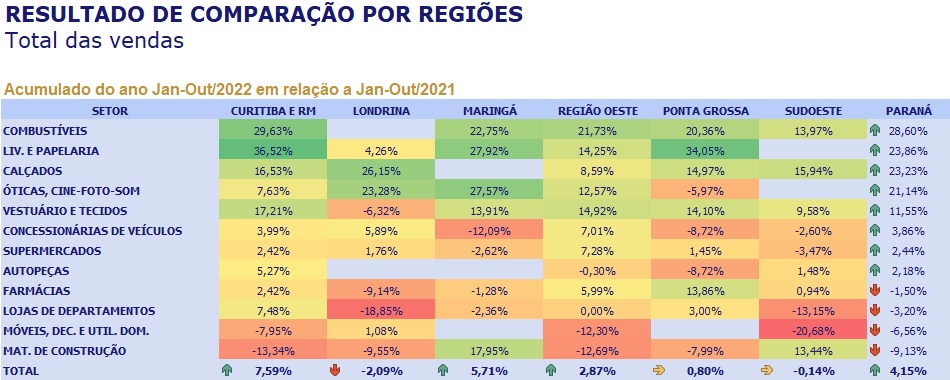Os dados regionais mostram que o maior volume de vendas no acumulado do ano foi registrado em Curitiba e Região Metropolitana, com elevação de 7,59%, seguindo por Maringá (5,71%), Região Oeste (2,87%) e Ponta Grossa (0,8%). Tiveram redução nas vendas as regiões de Londrina (-2,09%) e Sudoeste (-0,14%).