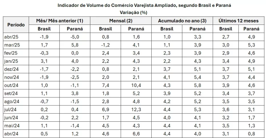 O comércio varejista ampliado do Paraná apresentou crescimento de 1,6% em abril deste ano em comparação com o mesmo mês de 2024, ficando acima da média nacional, que obteve aumento de 0,8% nas vendas.