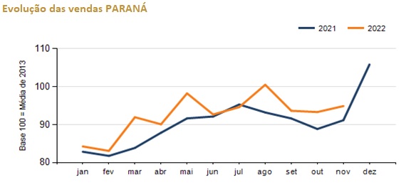 Na comparação com outubro, houve elevação de 1,69% e, em relação a novembro de 2021, o aumento nas vendas foi de 4,09%.