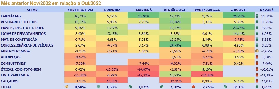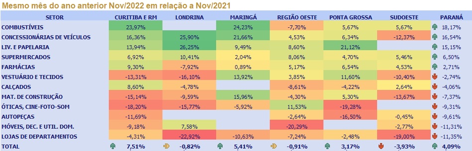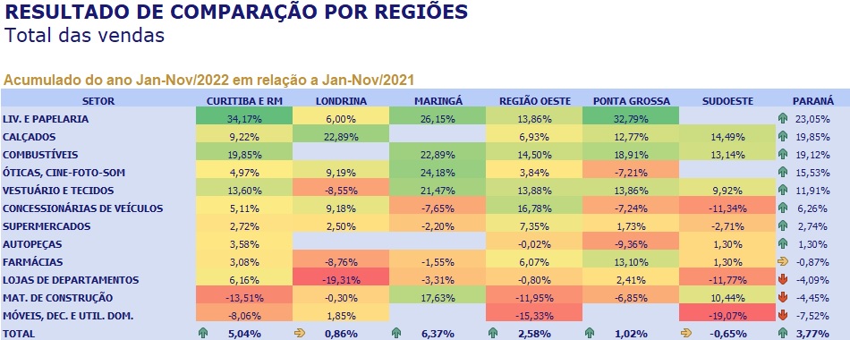 Em Curitiba e Região Metropolitana o varejo registrou elevação de 5,04% até novembro. Na sequência vieram a região Oeste (2,58%), Ponta Grossa (1,02%) e Londrina (0,86%). Somente a região Sudoeste apresentou queda de 0,65%.