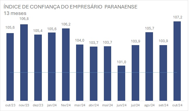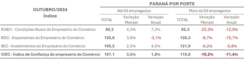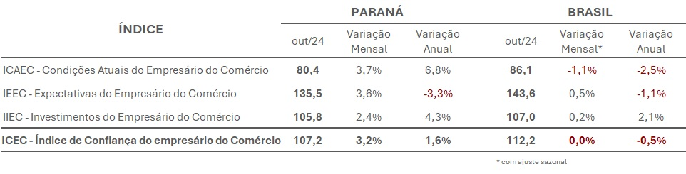 Após queda, o Índice de Confiança do Empresário do Comércio (ICEC) paranaense voltou a subir em outubro. O indicador, aferido pela Confederação Nacional do Comércio de Bens, Serviços e Turismo (CNC) e pela Federação do Comércio de Bens, Serviços e Turismo do Paraná (Fecomércio PR), ficou em 107,2, com elevação mensal de 3,2%. A média nacional permaneceu estável e marca 112,2 pontos.