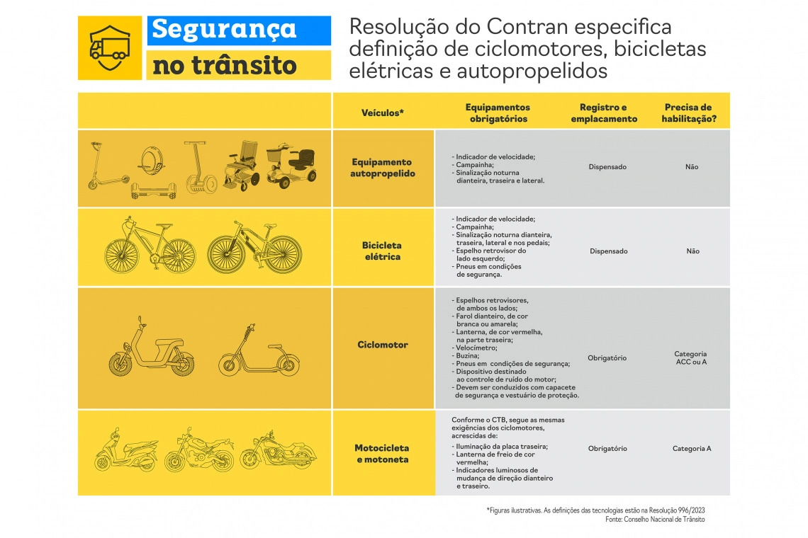 Segundo o diretor-presidente do Detran-PR, Adriano Furtado, para os veículos ciclomotores, como mobiletes ou scooters, é necessária habilitação categoria A ou autorização ACC, específica para estes tipos de veículos. “A estratégia da Resolução está alinhada às diretrizes e ações do Plano Nacional de Redução de Mortes e Lesões no Trânsito (Pnatrans), de preservar vidas. Com isso, fez-se necessário a definição de regras quanto à classificação de cada veículo, além de exigências relacionadas à habilitação e normas de circulação”, destaca.