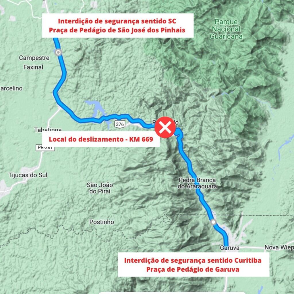 Um corpo foi encontrado no deslizamento de terra que interditou um trecho da BR-376 em Guaratuba, no litoral do Paraná, de acordo com a Polícia Rodoviária Federal (PRF). A vítima foi localizada por volta das 22h30 de ontem (28), mas não teve a identidade informada.