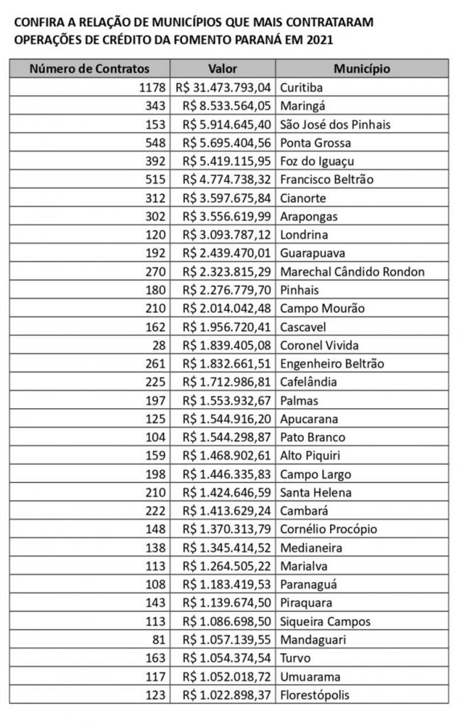 O município de Maringá (Noroeste) foi o principal destaque em volume de contratações no ano, com mais de R$ 8,5 milhões. Foi seguido por São José dos Pinhais (RMC), com R$ 5,9 milhões, Ponta Grossa (Campos Gerais), com R$ 5,7 milhões, Foz do Iguaçu (Oeste), com R$ 5,4 milhões, e Francisco Beltrão (Sudoeste), com R$ 4,7 milhões.