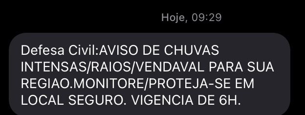Conforme o órgão, há possibilidade de chuvas intensas, raios e vendaval. Com vigência de seis horas, o alerta tem validade até as 15h29.