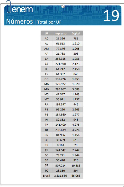No Paraná, 141.400 pessoas optaram pela versão impressa e 4.275 pela digital. O Enem Digital será aplicado nas cidades de Curitiba, Francisco Beltrão, Cascavel, Maringá, Apucarana e Londrina.