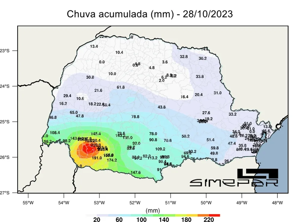 Pelo menos dez cidades do Paraná registraram mais de 100 mm de chuva neste sábado (28). Em cinco delas, em apenas um dia choveu mais da metade da média histórica registrada durante todo o mês de outubro. Em três, o volume de chuva foi superior a 20 mm. Veja lista abaixo.