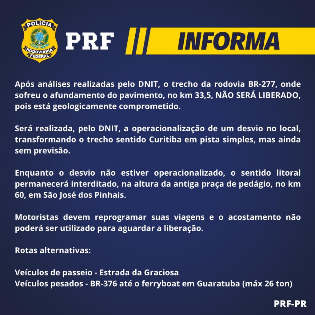 Após análises realizadas por geólogos e engenheiros do Departamento Nacional de Infraestrutura de Transportes (Dnit), o trecho da rodovia BR-277, onde sofreu o afundamento do pavimento, no km 33,5, não será liberado.
