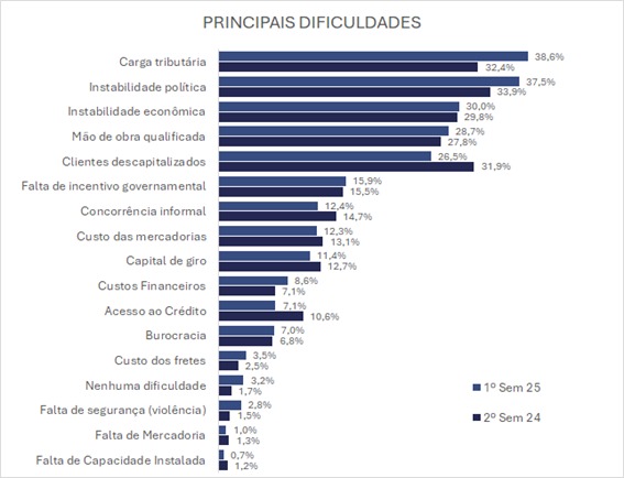 A carga tributária e a instabilidade política nacional seguem como as principais dificuldades relatadas pelos empresários. Além disso, preocupações como a instabilidade econômica, a falta de mão de obra qualificada e a perda de poder de compra dos clientes também aparecem entre os desafios que impactam os negócios.