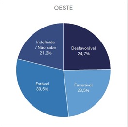 A parcela de gestores da região Oeste que projeta estabilidade no faturamento corresponde a 30,6%, enquanto 24,7% demonstram expectativas desfavoráveis. Outros 21,2% preferiram não opinar ou ainda não têm uma avaliação definida.