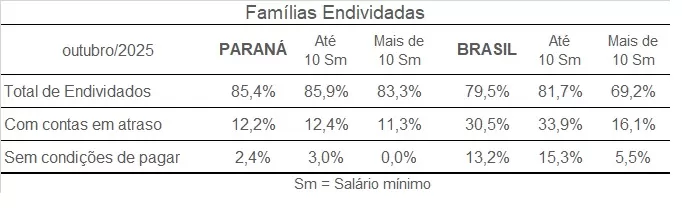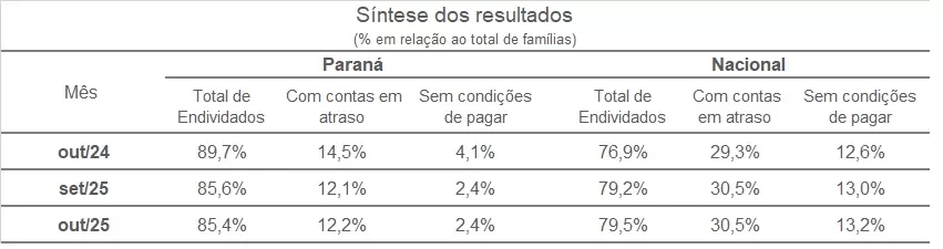 O nível de endividamento das famílias paranaenses manteve-se estável em outubro, permanecendo no mesmo patamar observado desde o início do segundo semestre. De acordo com a Pesquisa de Endividamento e Inadimplência do Consumidor (Peic), realizada pela Confederação Nacional do Comércio de Bens, Serviços e Turismo (CNC) e pela Federação do Comércio de Bens, Serviços e Turismo do Paraná (Fecomércio PR), 85,4% das famílias do estado declararam possuir algum tipo de dívida no mês.