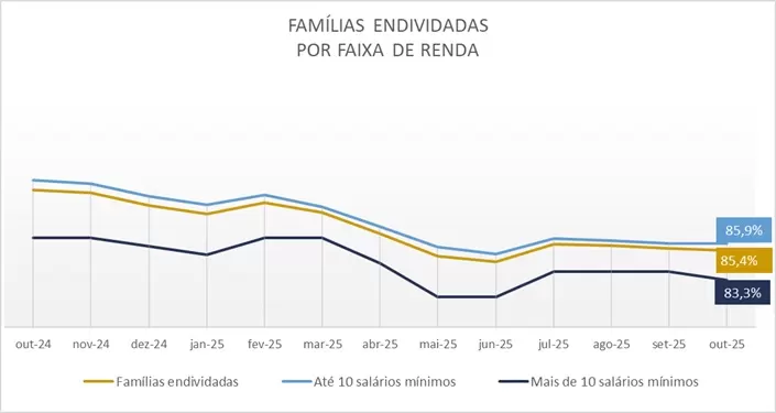 Entre os grupos de renda, o endividamento é mais elevado entre as famílias com rendimentos de até dez salários mínimos, que somaram 85,9% de endividados e 12,4% de inadimplentes, além de 3% que admitem não ter condições de pagar suas dívidas. Já nas famílias com renda superior a dez salários mínimos, o indicador de endividamento recuou de 83,9% em setembro para 83,3% em outubro. Nessa faixa, 11,3% estão com parcelas em atraso, mas todas afirmam ter condições de regularizar os débitos.