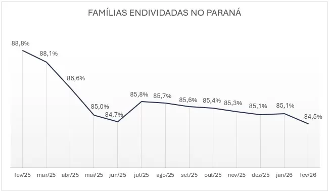Os paranaenses vêm demonstrando maior controle sobre suas dívidas. É o que indica a Pesquisa de Endividamento e Inadimplência do Consumidor (Peic), elaborada pela Confederação Nacional do Comércio de Bens, Serviços e Turismo (CNC) em parceria com a Fecomércio PR. Em fevereiro, o percentual de famílias com algum tipo de dívida no estado recuou de 85,1% em janeiro para 84,5%.