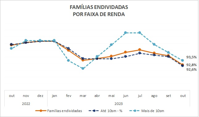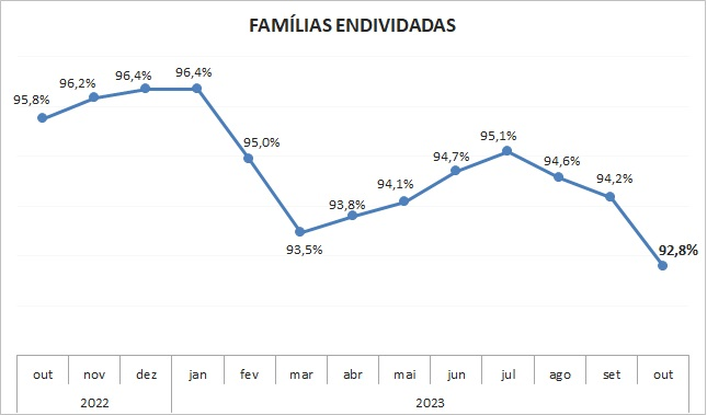 Observa-se um movimento nacional de queda no endividamento, que ficou em 76,9% em outubro, bem como uma redução no indicador do risco de inadimplência: menos brasileiros atrasaram o pagamento de dívidas em outubro (29,7% do total de famílias, ante 30,2% em setembro e 30,3% em outubro de 2022).