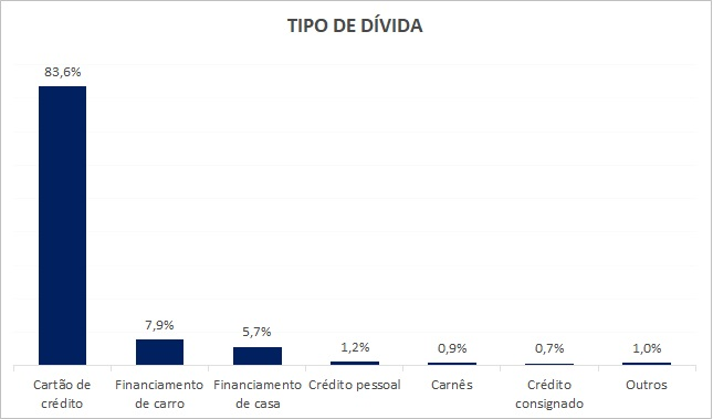 O cartão de crédito concentrou 83,6% das dívidas em outubro, enquanto o financiamento de veículo correspondeu a 7,9% e a financiamento imobiliário a 5,7%.