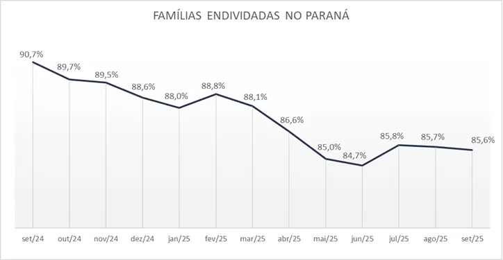 A proporção de famílias inadimplentes também recuou. O índice caiu de 15,1% em setembro de 2024 para 12,1% neste ano, com estabilidade em relação a agosto (12,4%), posicionando o estado na 26ª posição do ranking nacional quando se trata da inadimplência. Já as famílias que afirmam não ter condições de pagar suas dívidas representam 2,4% no Paraná, o mesmo patamar do mês anterior e menos da metade do registrado no ano passado (4,7%).