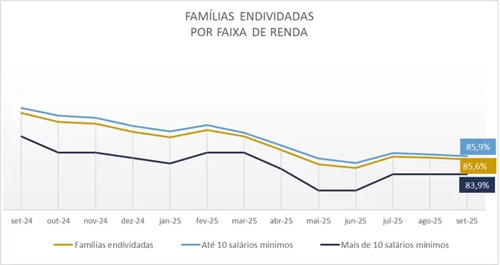 O endividamento é maior entre as famílias com renda até dez salários mínimos, com 85,9% delas relatando algum tipo de dívida, ante 83,9% entre as famílias com renda acima deste patamar. A inadimplência é levemente maior entre as famílias com renda até dez salários mínimos (12,3%). Contudo, observa-se um aumento da inadimplência entre os consumidores de maior renda a partir de julho, alcançando 11,3% em setembro.