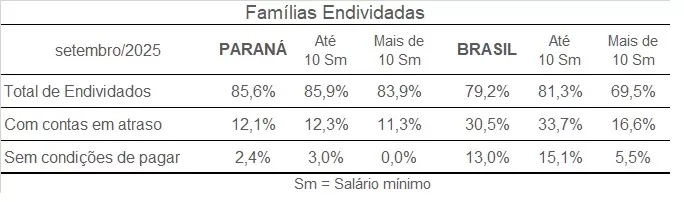 No cenário nacional, o endividamento avançou de 78,8% para 79,2% em setembro. Além disso, o volume de inadimplentes é muito superior ao do Paraná: 30,5% das famílias brasileiras estão com contas em atraso, um novo recorde histórico, e 13% afirmam não ter condições de pagar as dívidas, ante apenas 2,4% no estado.